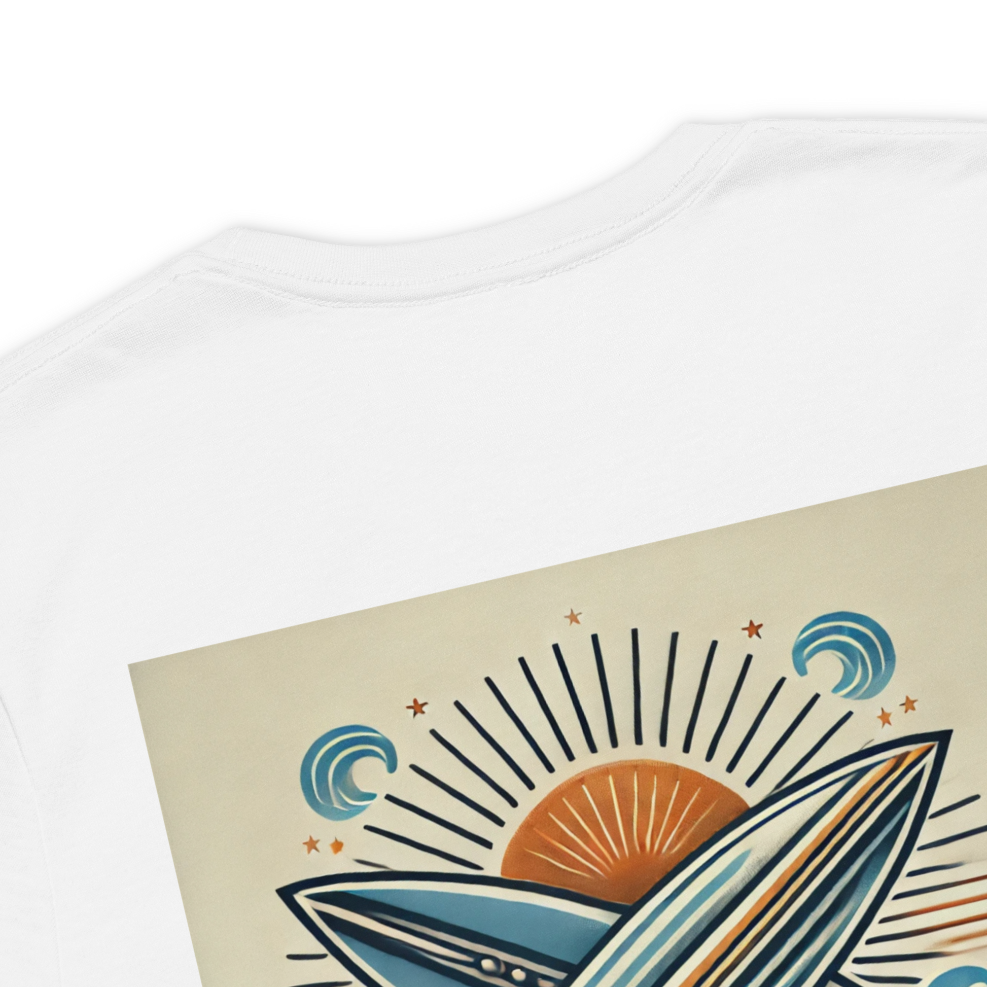 ✅Diseño elegante y atemporal:  Gráficos vibrantes en la espalda con un par de tablas de surf cruzadas bajo un atardecer épico, evocando la energía del océano.