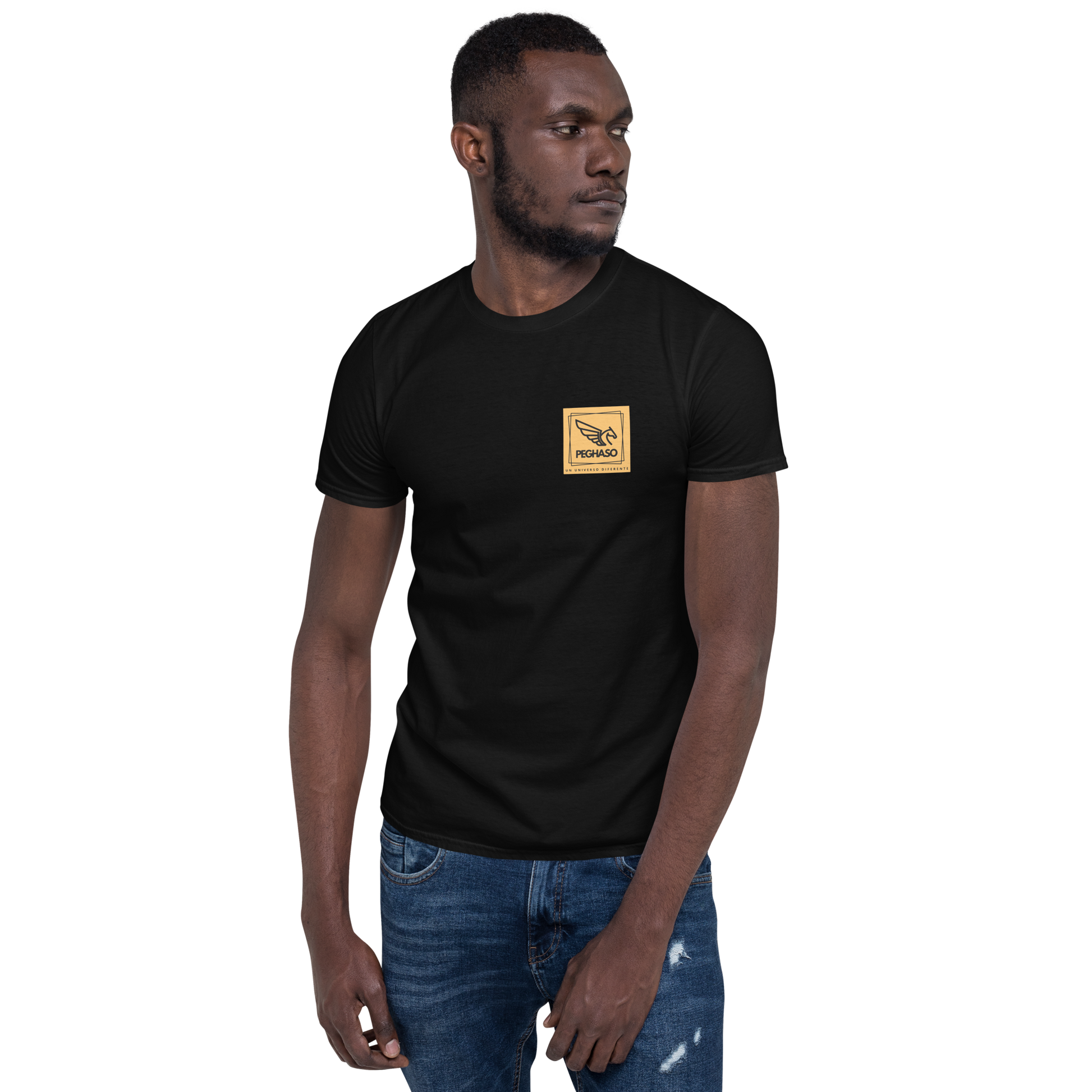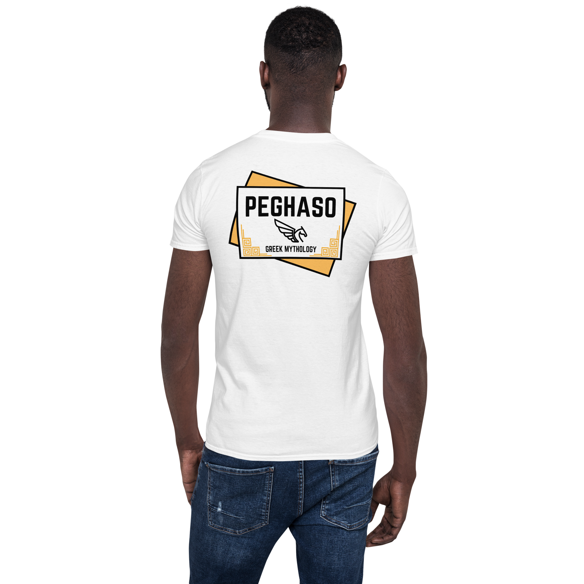 Camiseta PEGHASO GREEK MYTHOLOGY. Un diseño en la espalda original de PEGHASO, inspirado en la Mitología Griega. En el lado izquierdo del pecho lleva el sello de identidad de nuestra marca PEGHASO completamente relleno de color. Colores disponibles: negra y blanca.