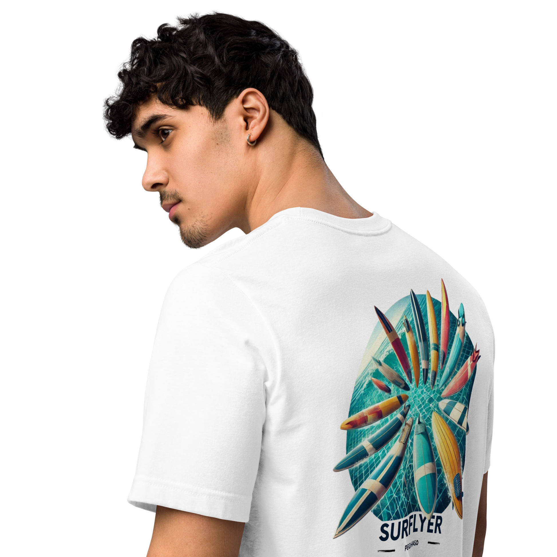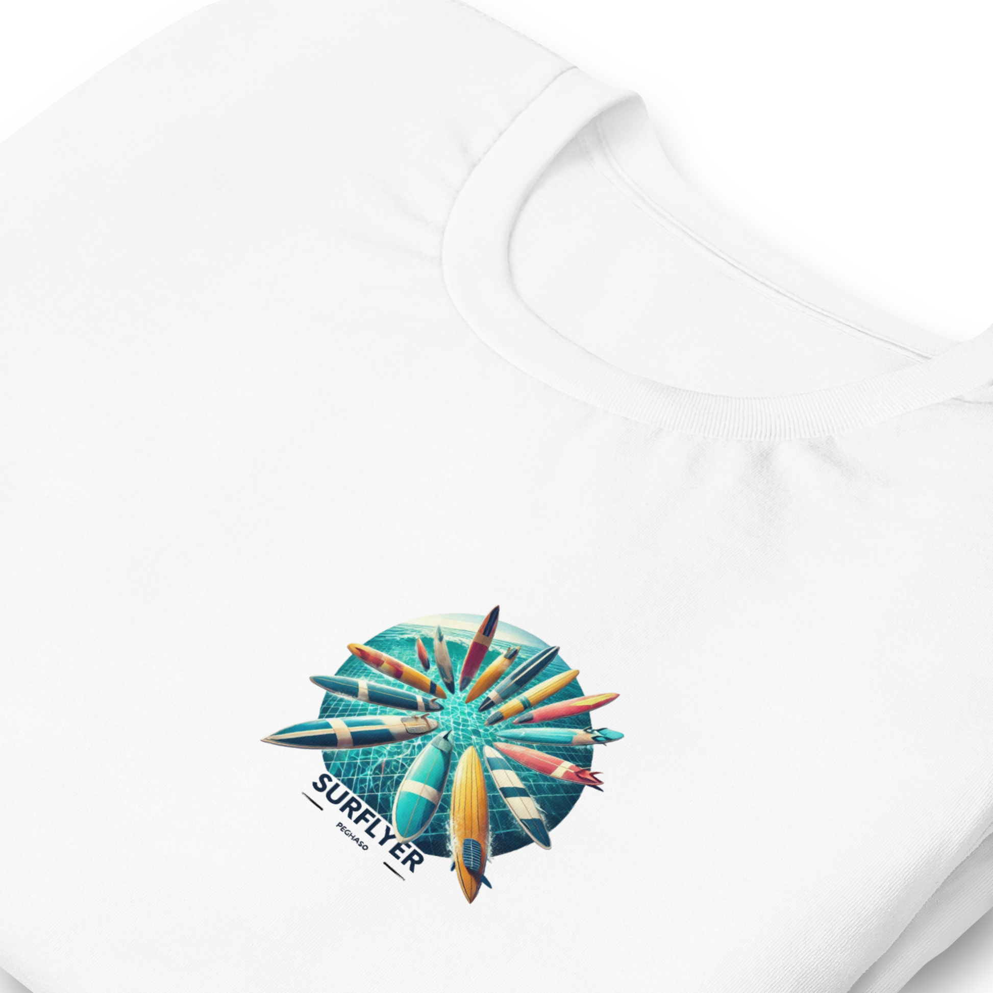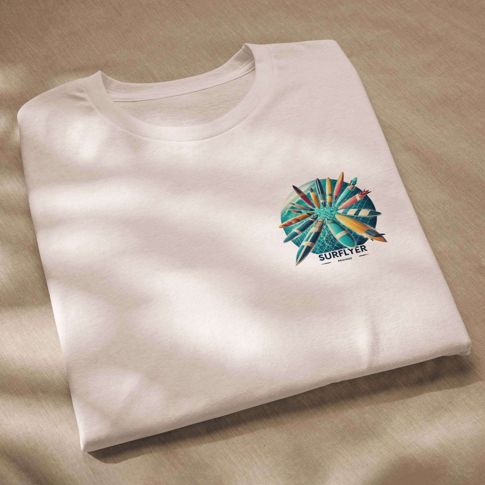 La camiseta PEGHASO "Surflyer Halo " captura la esencia del surf en su máxima expresión. Inspirada en la conexión infinita con el océano, su diseño presenta un halo de tablas sobre aguas cristalinas, simbolizando la hermandad y pasión por las olas. Un diseño vibrante que rinde homenaje al estilo de vida surfero con un toque artístico y moderno.