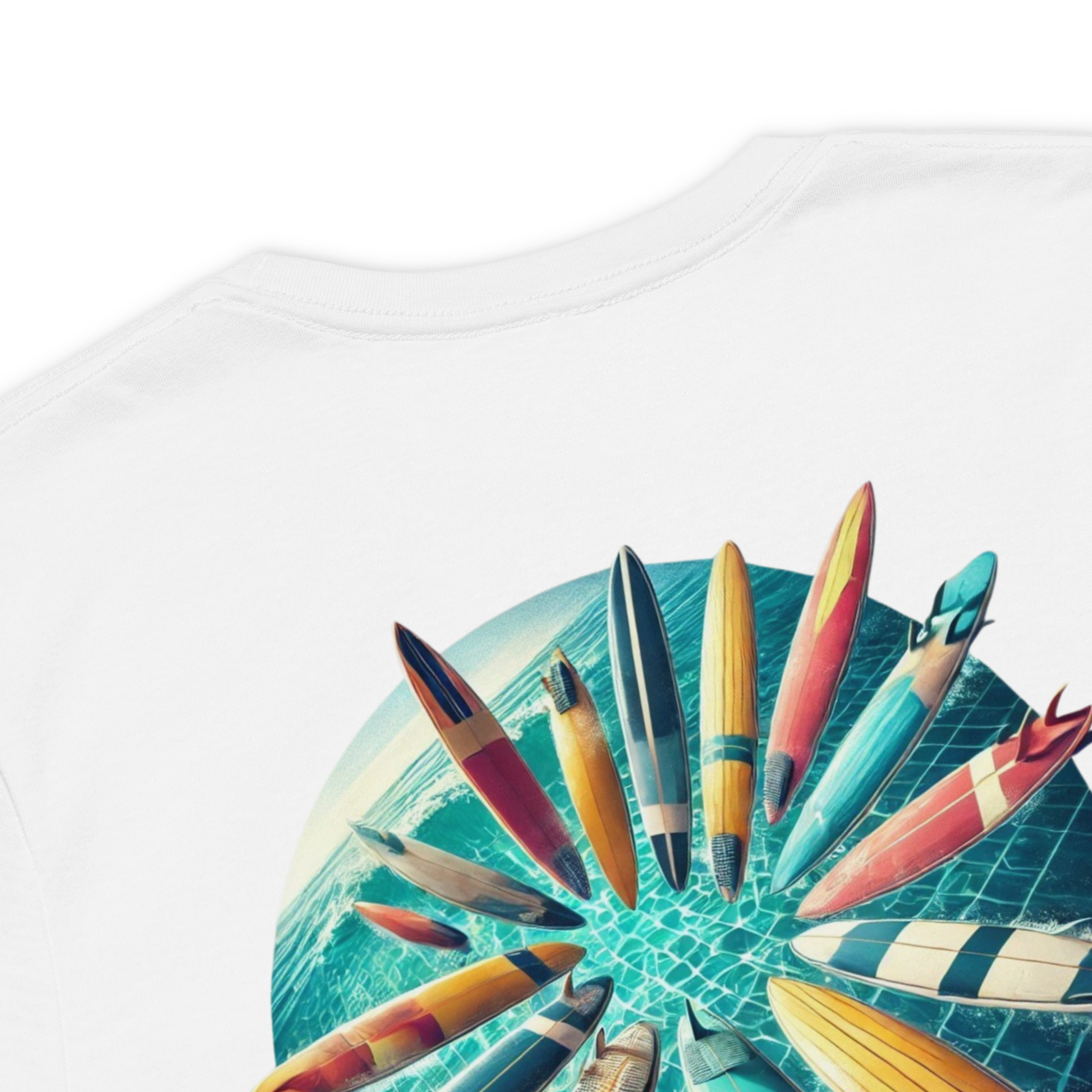✅ Diseño impactante : Gráfico trasero con un círculo de tablas de surf sobre una vista aérea del mar.